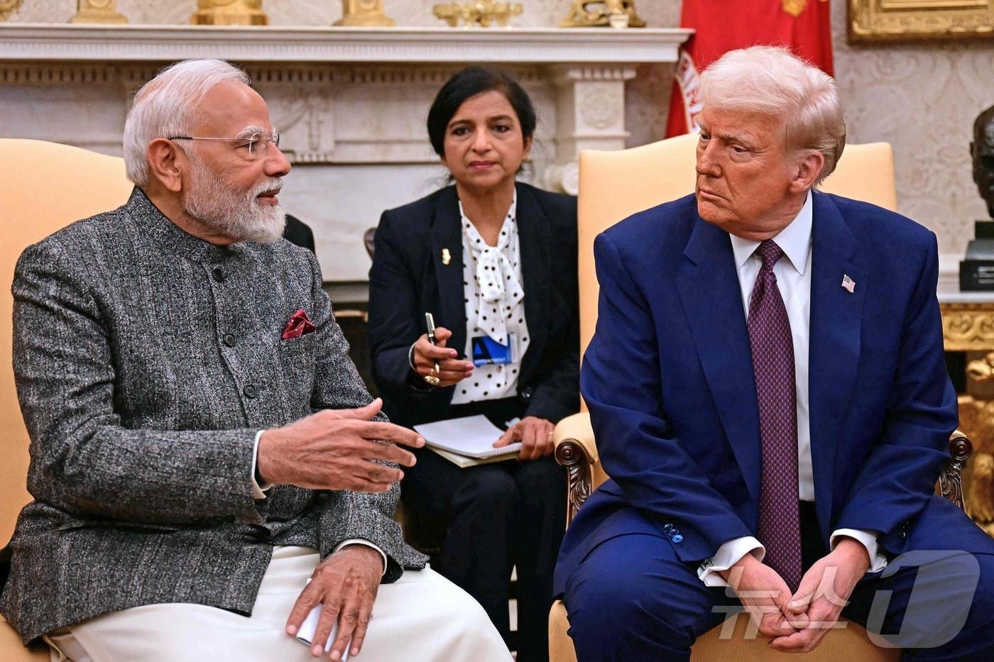 도널드 트럼프 미국 대통령이 13일(현지시간) 워싱턴 백악관에서 나렌드라 모디 인도 총리와 회담을 하고 있다. 2025.02.14 ⓒ AFP=뉴스1 ⓒ News1 우동명 기자