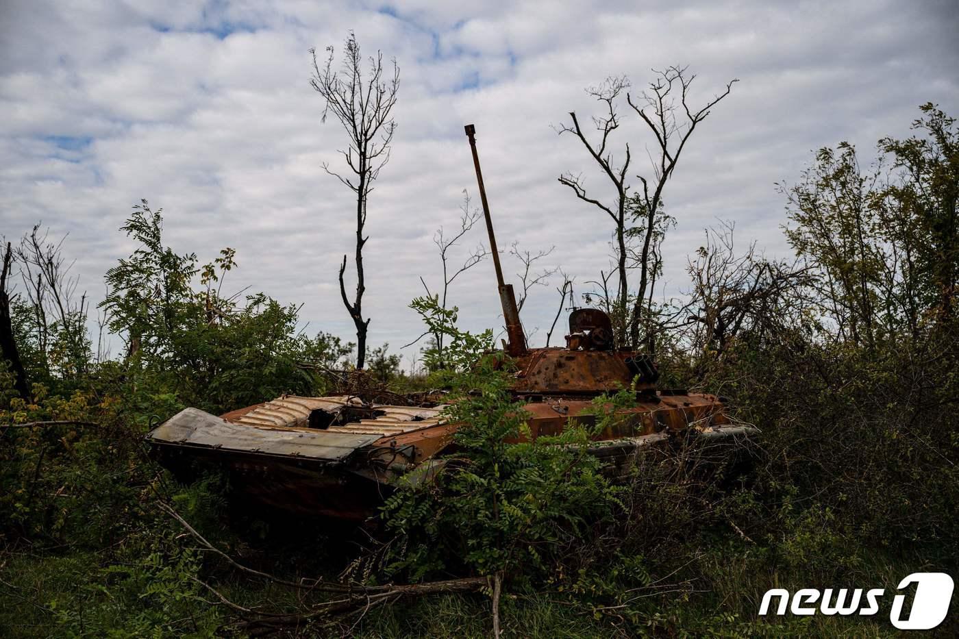 9일(현지시간) 우크라이나 남부에서 파괴된 러시아 군 차륜형 장갑차(APC)가 보인다. 2022.10.09 ⓒ AFP=뉴스1 ⓒ News1 한병찬 기자