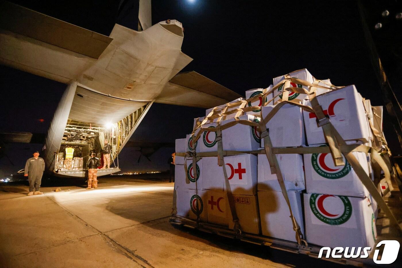 6일(현지시간) 이라크 바그다드 국제공항에서 국제적신월이 시리아 지진 피해자들에게 보낼 구호물품을 싣고 있다.. ⓒ 로이터=뉴스1 ⓒ News1 박재하 기자