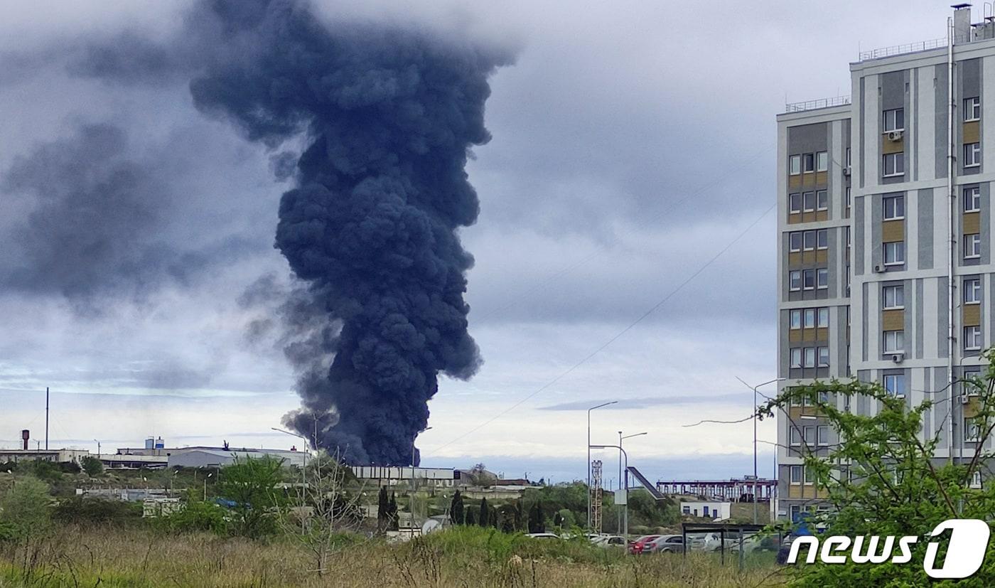 지난 4월29일(현지시간) 우크라이나 크림반도(크름반도) 최대 도시 세바스토폴의 연료 탱크가 드론 공격을 받고 검은 연기를 내뿜고 있다. 2023.4.29 ⓒ 로이터=뉴스1 ⓒ News1 정윤미 기자