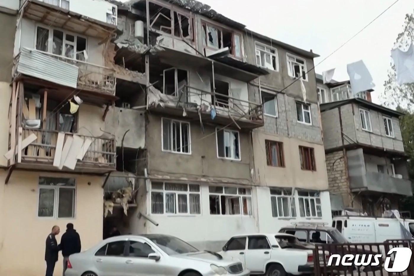 20일(현지시간) 아제르바이젠 스테파나케르트의 한 아파트가 아르메니아의 공세로 인해 파손된 모습이다. 앞서 아르메니아와 아제르바이젠은 분쟁 지역인 나고르노-카라바흐를 두고 충돌했으나 러시아 평화유지군의 중재로 휴전에 합의했다. 2023.09.20/ ⓒ AFP=뉴스1 ⓒ News1 장성희 기자