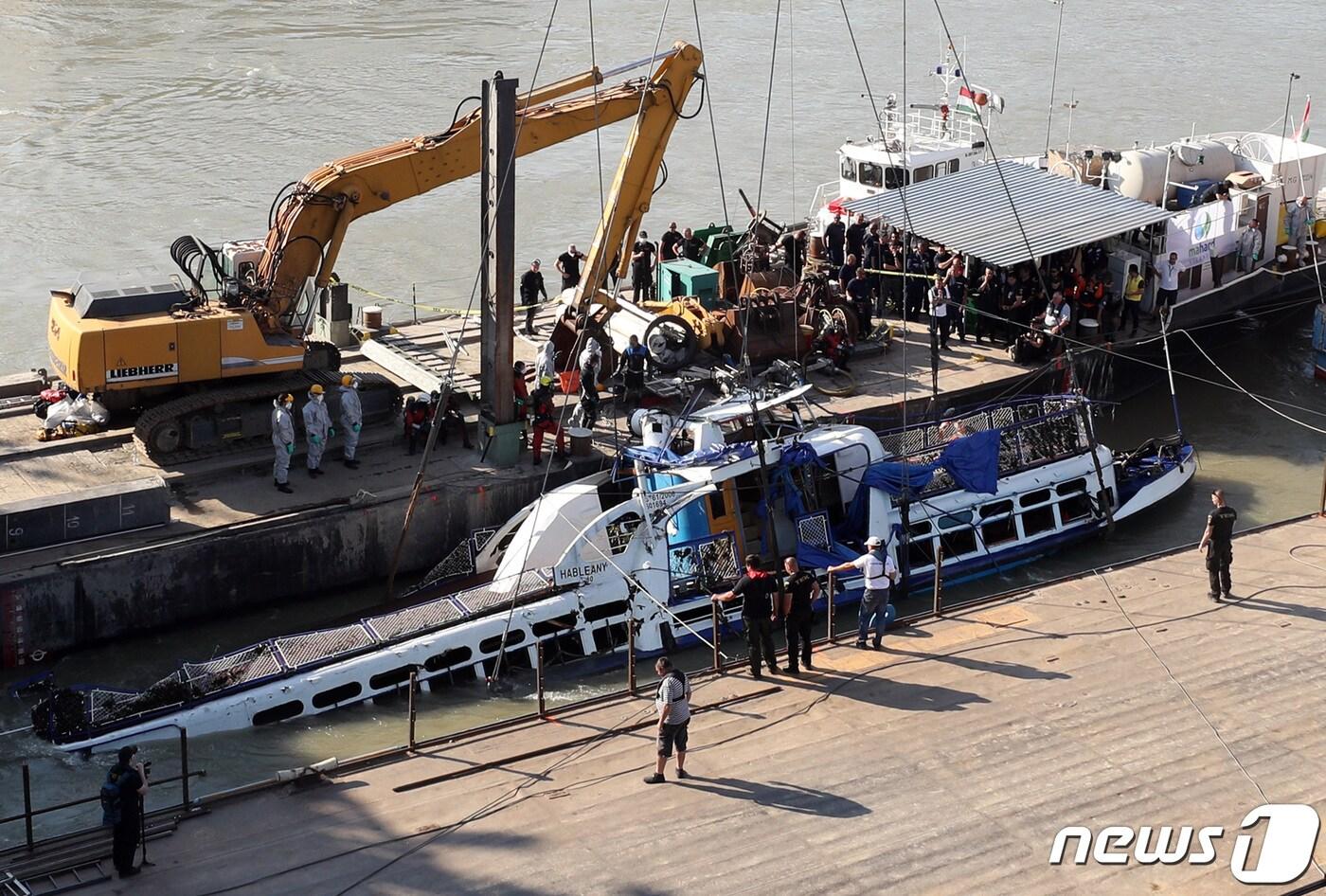 유람선 '허블레아니호' 사고 2주째인 11일 오전(현지시간) 헝가리 부다페스트 다뉴브강 머르기트 다리 인근 침몰현장에서 헝가리 대테러청(TEK) 등 관계자들이 선체인양작업을 하고 있다. 2019.6.11/뉴스1 ⓒ News1 구윤성 기자