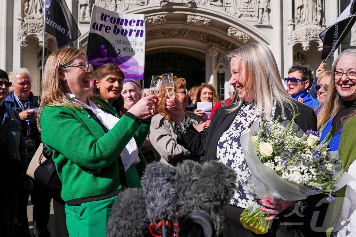 英정부·JK 롤링은 "명확성 준다"며 환영…트랜스젠더 단체는 "우려"16일(현지시간) 영국 런던 대법원 밖에서 스코틀랜드 여성단체 '포 우먼 스코틀랜드'(For Women Scotland·FWS) 활동가인 스전 스미스와 마리오 칼더가 샴페인 잔을 부딪히고 있다. 이날 대법원은 영국 평등법의 여성이 생물학적 여성을 의미한다고 판결했다. 2025.04.16 ⓒ 로이터=뉴스1 ⓒ News1 김지완 기자관련 키워드트랜스젠더생물학적 여성영국영국 대법원성소수자관련 기사성전환 여자 축구선수, 6월부터 잉글랜드에서 못 뛴다