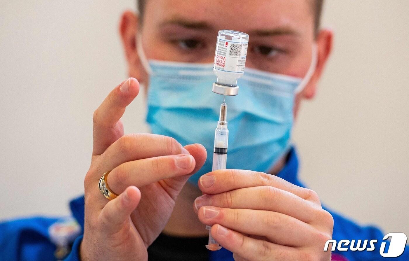 2021년 4월 20일 미국 코네티컷 한 병원에서 간호사가 모더나 코로나19 백신 접종을 준비하는 모습. ⓒ AFP=뉴스1