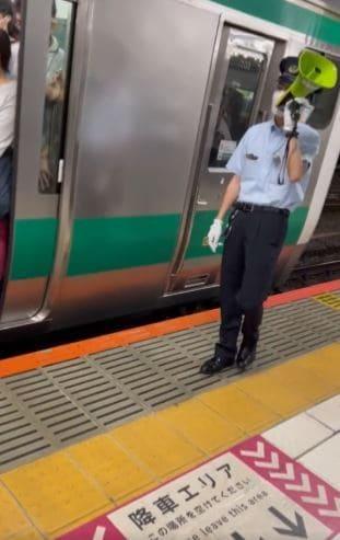 도쿄 신주쿠역 승강장에서 "치한이 '계신다'. 뒤 칸으로 이동해 달라"고 멘트한 역무원. (트위터)