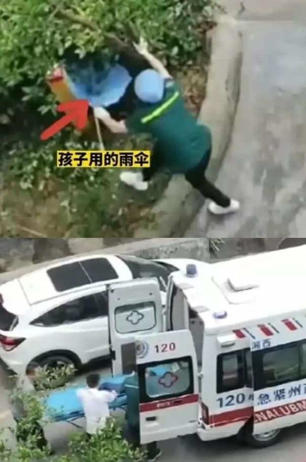 만화 속 캐릭터를 흉내 내려고 26층에서 뛰어내린 아이가 구조돼 구급차에 실려가는 모습. 아이는 다행히 골절상을 입고 생명에는 지장이 없는 것으로 전해졌다. (중국 넷이즈)관련 키워드26층아동추락사고