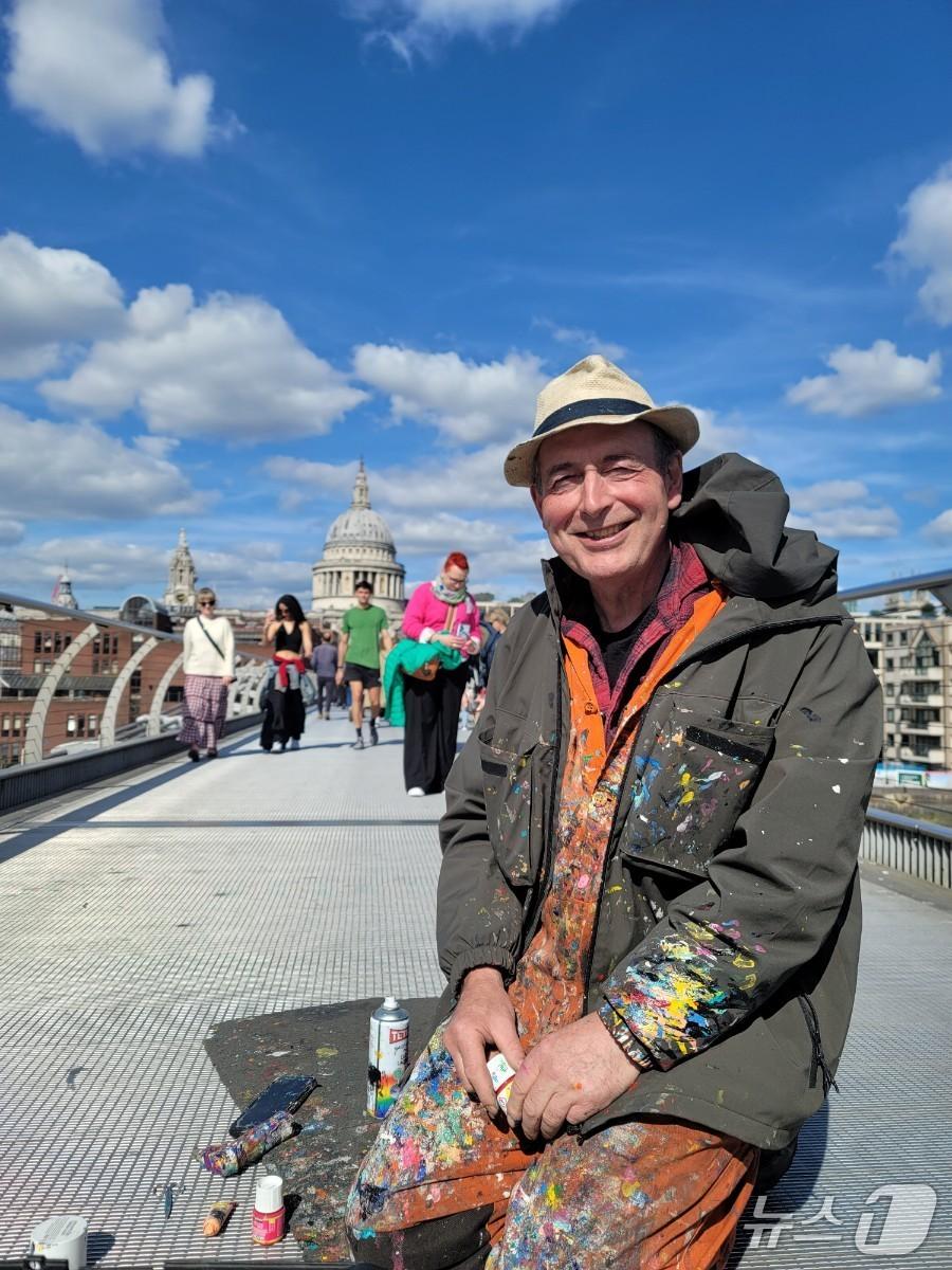 영국의 유명 환경 예술가 벤 윌슨(Ben Wilson)이 밀레니엄 브리지 바닥 위에서 아크릴 물감을 손에 쥔 채 환하게 웃고 있다. @조아현