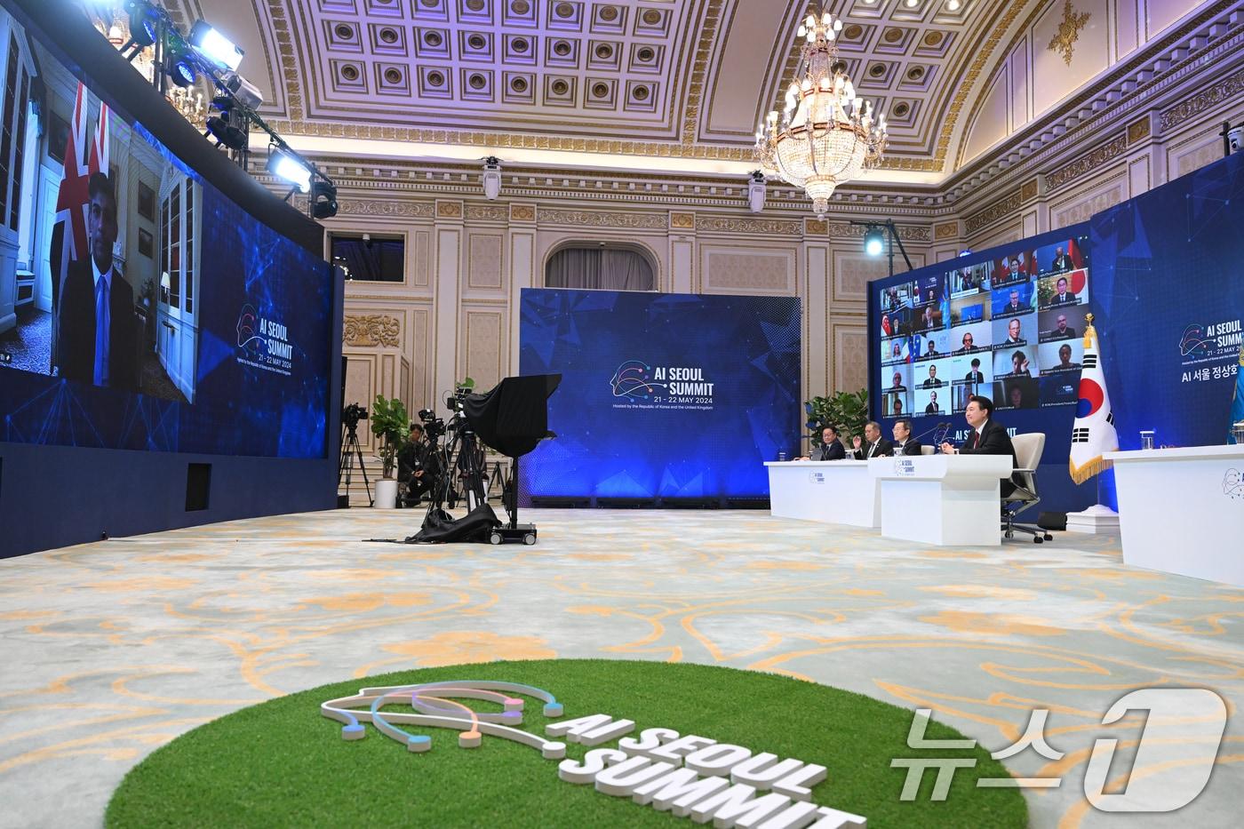 윤석열 대통령이 21일 청와대 영빈관에서 주요 7개국(G7)을 비롯한 주요국 정상과 국제기구 수장 등이 참석하는 'AI(인공지능) 서울 정상회의'를 화상으로 주재하며 리시 수낵 영국 총리의 발언을 청취하고 있다. (대통령실 제공) 2024.5.21/뉴스1 ⓒ News1 오대일 기자