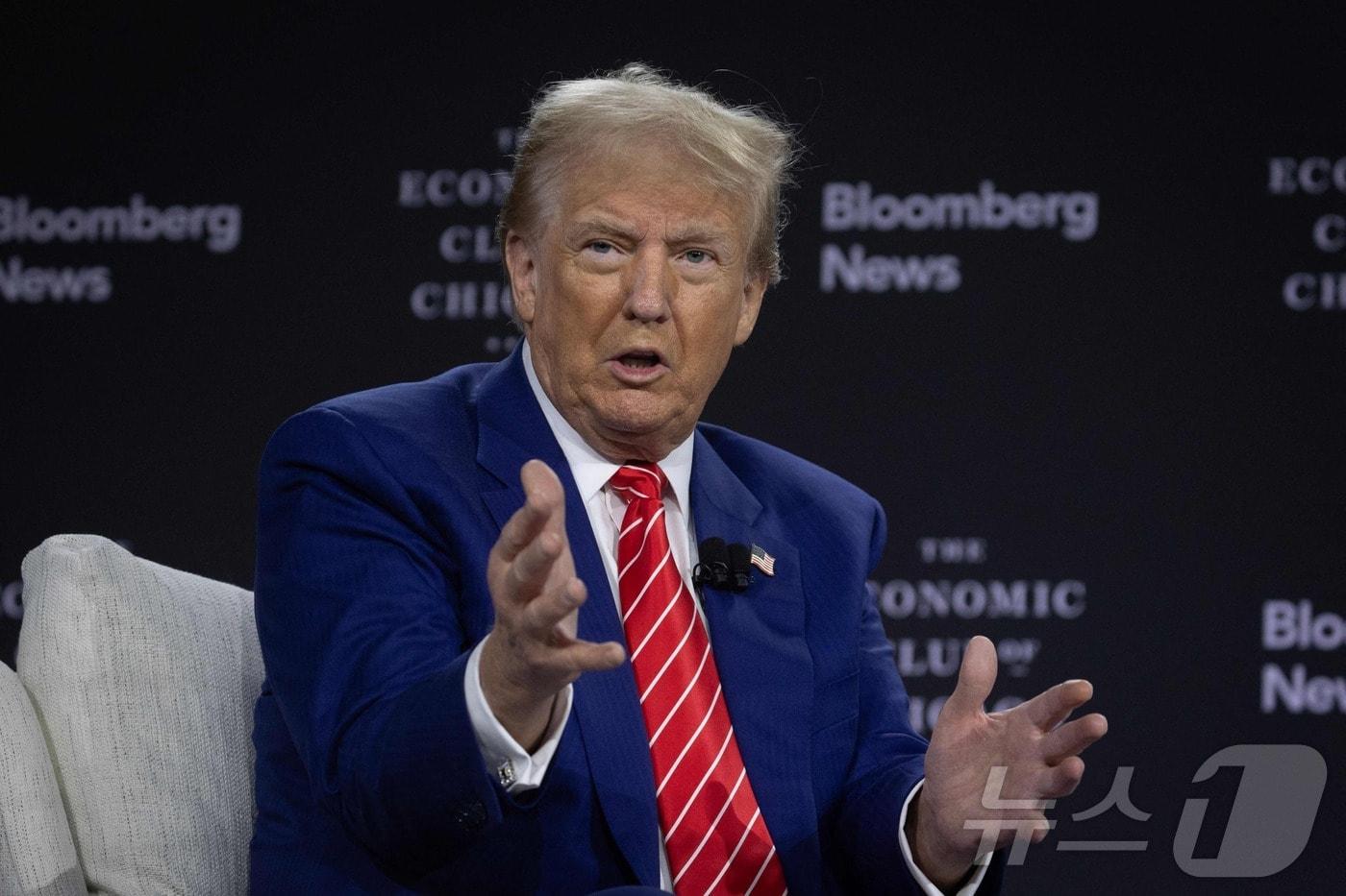 미국 공화당 대선 후보 도널드 트럼프 전 대통령이 15일(현지시간) 일리노이주 시카고의 ‘시카고 경제클럽’에서 열린 존 미클스웨이트 블룸버그통신 편집국장과 대담서 “자신이 재임하고 있었다면 한국이 주한미군 방위비 분담금으로 연간 100억달러(약 13조원)를 지불했을 것”이라고 말하고 있다.2024.10.16 ⓒ AFP=뉴스1 ⓒ News1 우동명 기자
