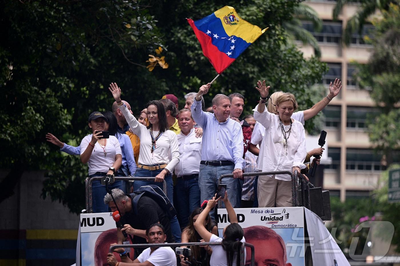 7월 30일(현지시간) 베네수엘라 카라카스에서 야당 대표 마리아 코리나 마차도(왼쪽)와 같은 당 대선 후보 에드문도 곤살레스가 지지자들에게 손을 흔드는 모습. 9월 2일 베네수엘라 법원은 대선 결과에 불복한 곤살레스 후보를 상대로 '내란 선동' 혐의를 적용해 체포 영장을 발부했다. 2024.07.30 ⓒ 로이터=뉴스1 ⓒ News1 유수연 기자