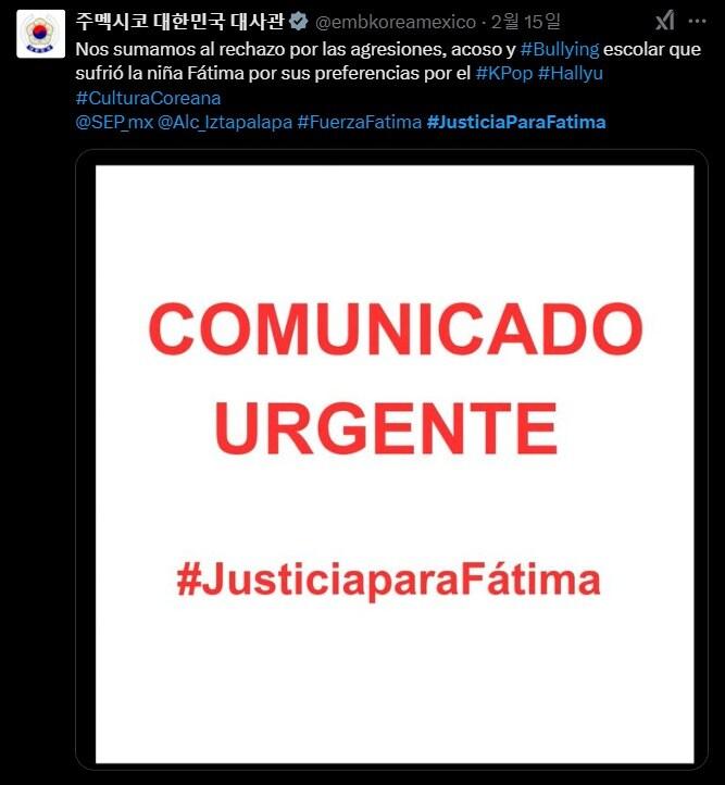 주멕 한국대사관 "K-팝으로 청소년이 겪는 모든 공격 규탄"온라인서 피해자 연대 및 가해자 엄벌 요구 움직임멕시코 주재 한국 대사관 엑스.관련 키워드파티마집단 따돌림K-팝김경민 기자 트럼프, 노벨평화상 들고 활짝…마차도 "결단력 기리며 증정"美, 내달 동맹국 외교장관 모아 '핵심광물 합의' 모색…"中의존 탈피"