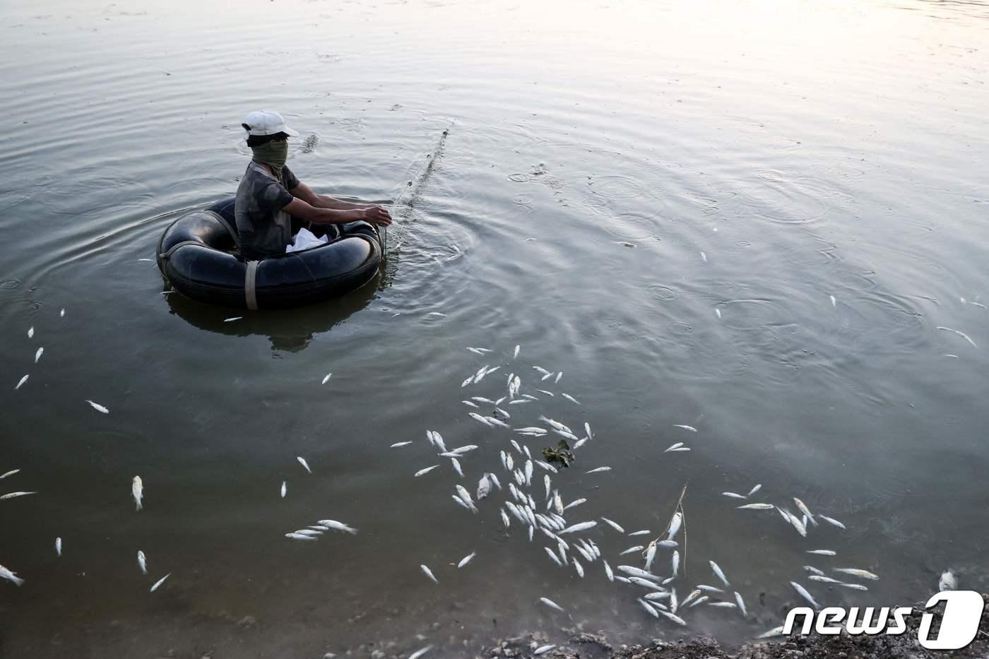 시리아 하마주 티그리스강에서 한 남성이 죽은 물고기가 떠다니는 가운데 그물을 당기고 있다. 이 강엔 인근 설탕공장에서 사용된 후 버려진 화학물질이 가득한 것으로 알려졌다. 2022.07.03 ⓒ AFP=뉴스1 ⓒ News1 김예원 기자