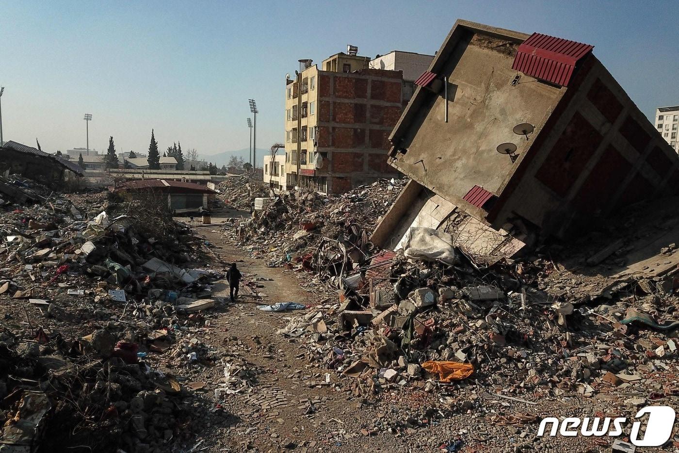14일 (현지시간) 규모 7.8의 지진이 강타한 튀르키예 카라만마라슈의 붕괴된 건물 잔해 주변에서 기울어진 건물이 보인다. ⓒ AFP=뉴스1 ⓒ News1 우동명 기자