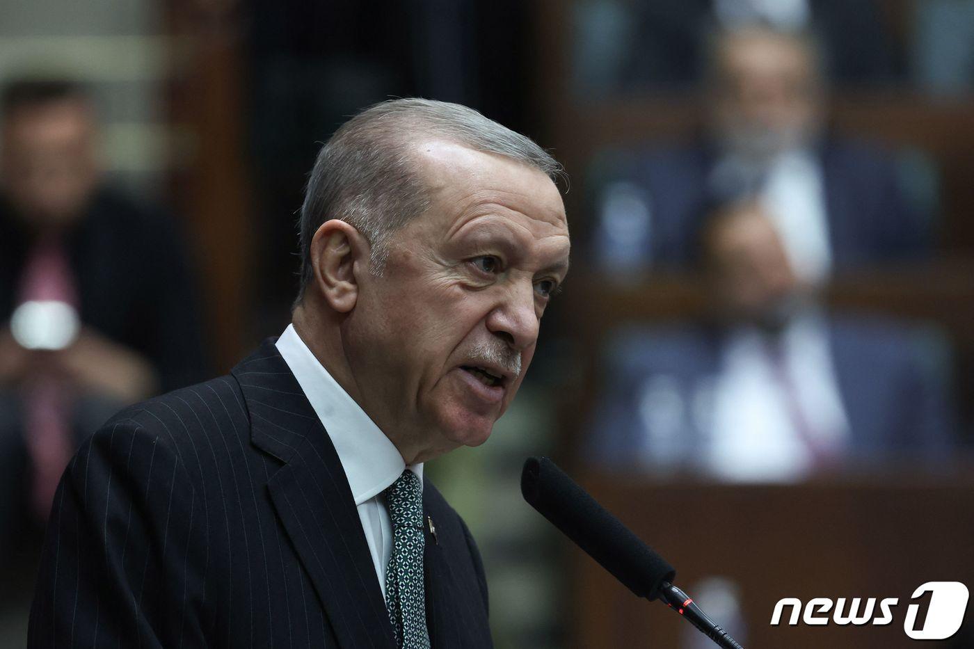 레제프 타이이프 에르도안 튀르키예(터키) 대통령이 1일(현지시간) 앙카라 국회에서 집권 정의개발당 의원들 앞에서 발언하고 있다. ⓒ AFP=뉴스1 ⓒ News1 강민경 기자