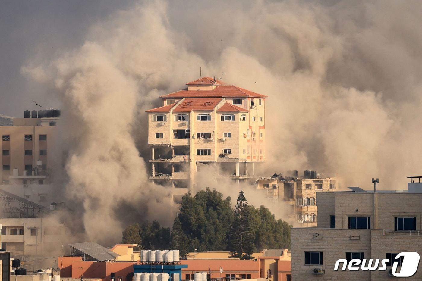 11일(현지시간) 팔레스타인 무장 정파 하마스의 기습 공격에 대응한 이스라엘 군의 포격을 받은 가자 지구 주택가에서 연기가 솟아 오르고 있다. 2023.10.12 ⓒ AFP=뉴스1 ⓒ News1 우동명 기자