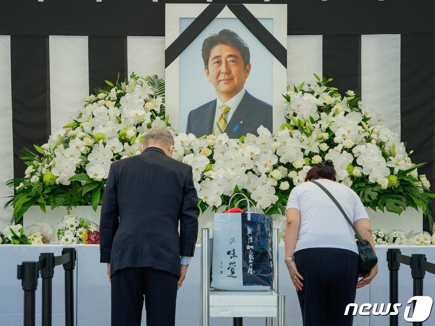 27일 오전 아베 신조 일본 총리의 국장을 앞두고 일본 도쿄의 일본무도관(日本武道館) 밖에 마련된 분향소에서 영정 앞에 선 조문객들이 애도하는 마음을 담아 허리를 숙이며 마지막 인사를 하고 있다. 아베 전 총리의 장례식은 이날 오후 일본무도관에서 국장으로 치러진다. ⓒ 로이터=뉴스1 ⓒ News1 김성식 기자
