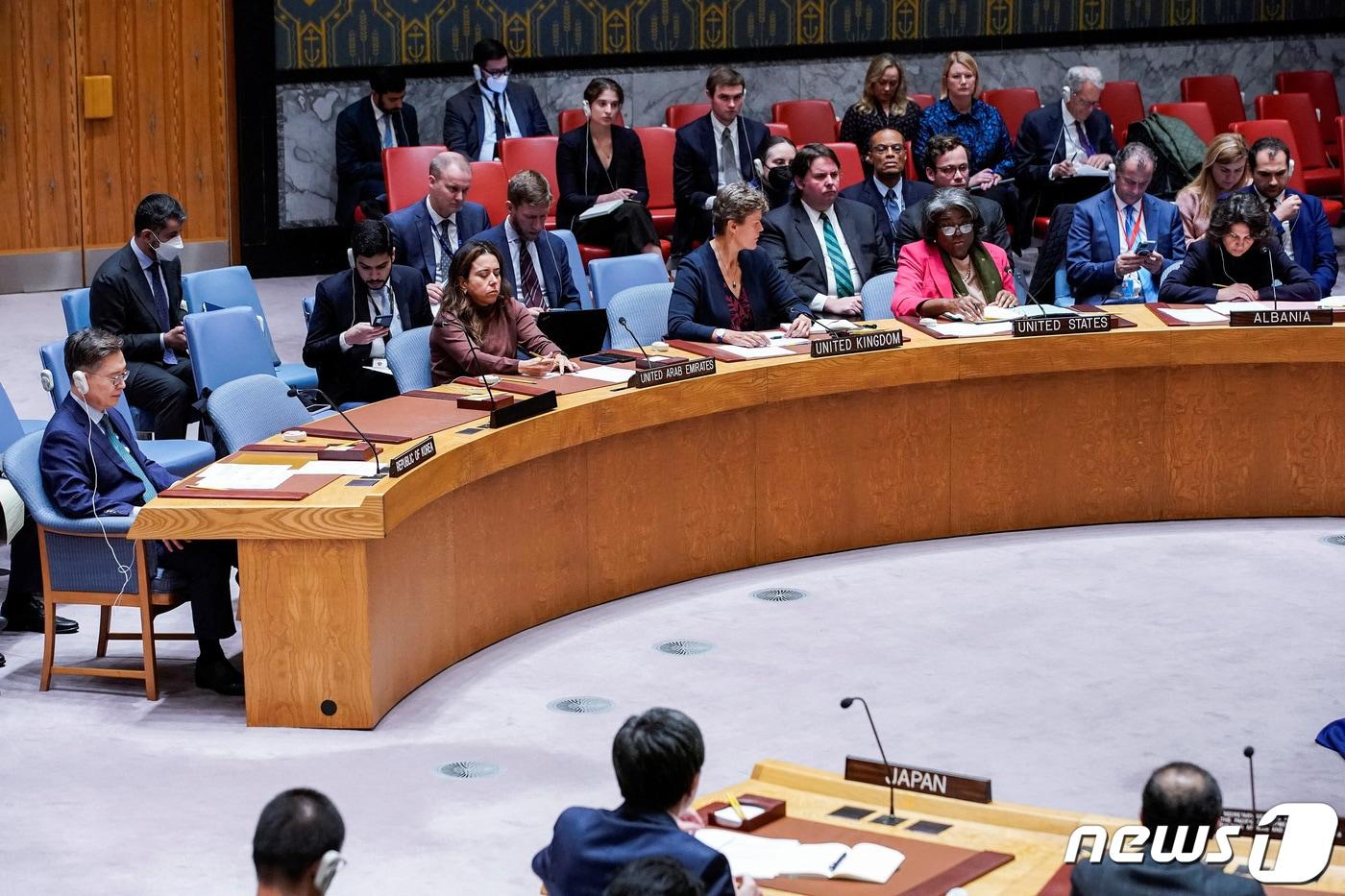 북한이 5년 만에 일본 영공을 넘는 중거리탄도미사일(IRBM)을 발사한 가운데 5일(현지시간) 미국 뉴욕에서 린다 토머스-그린필드 미국 유엔 대사가 유엔 안전보장이사회 회의에 참석해 발언하고 있다. 이날 안보리 긴급회의는 북한의 IRBM 발사 직후 미국 정부의 요청으로 소집됐고 한국과 일본은 이해 당사국으로 참석했다. ⓒ 로이터=뉴스1 ⓒ News1 김성식 기자