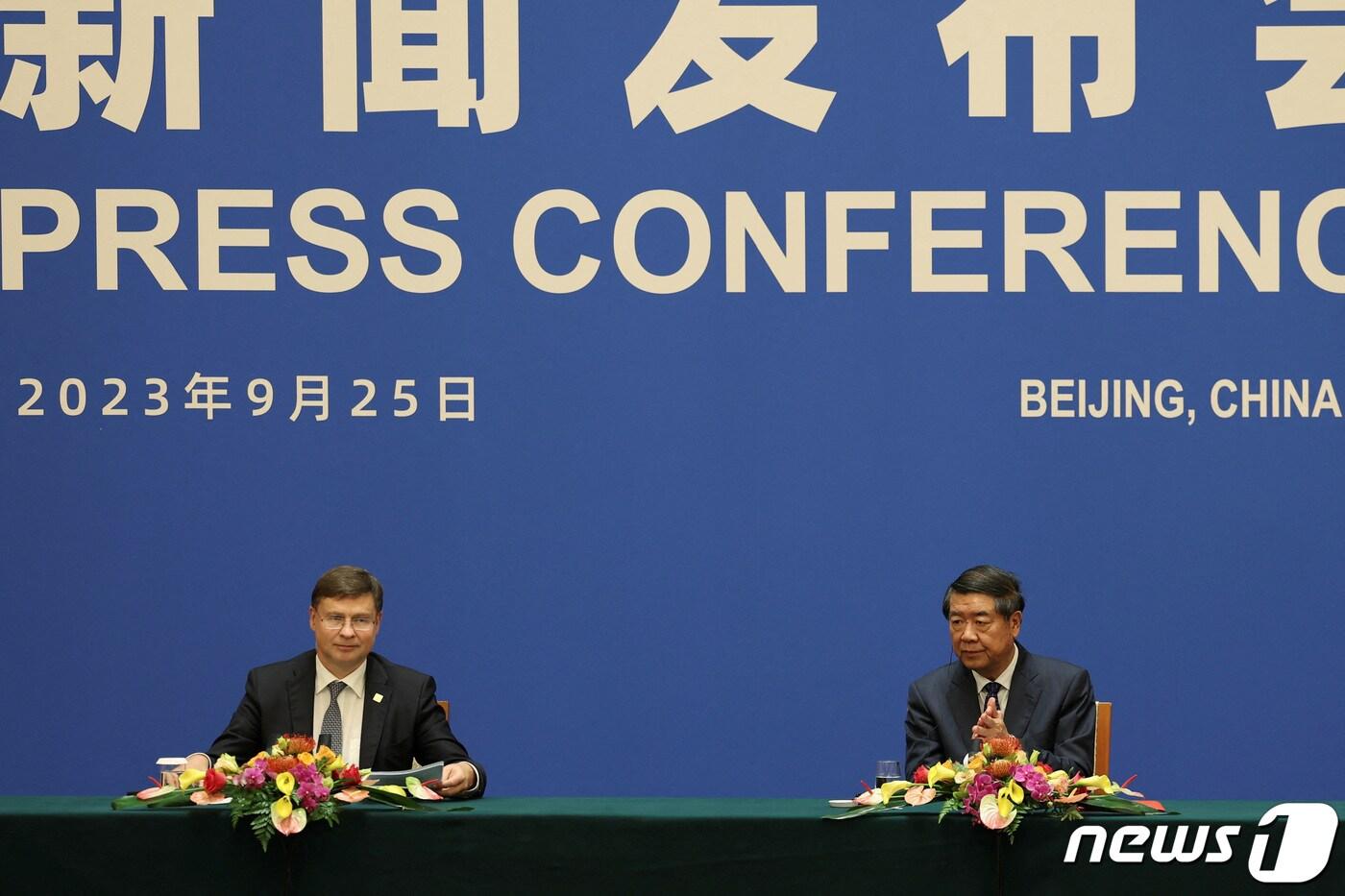 허리펑 중국 국무원 부총리와 발디스 돔브로우스키스 유럽연합(EU) 경제·통상 담당 수석 집행부위원장은 베이징에서 제 10차 고위급 경제무역 대화를 공동 주재했다. 2023.09.25 ⓒ 로이터=뉴스1 ⓒ News1