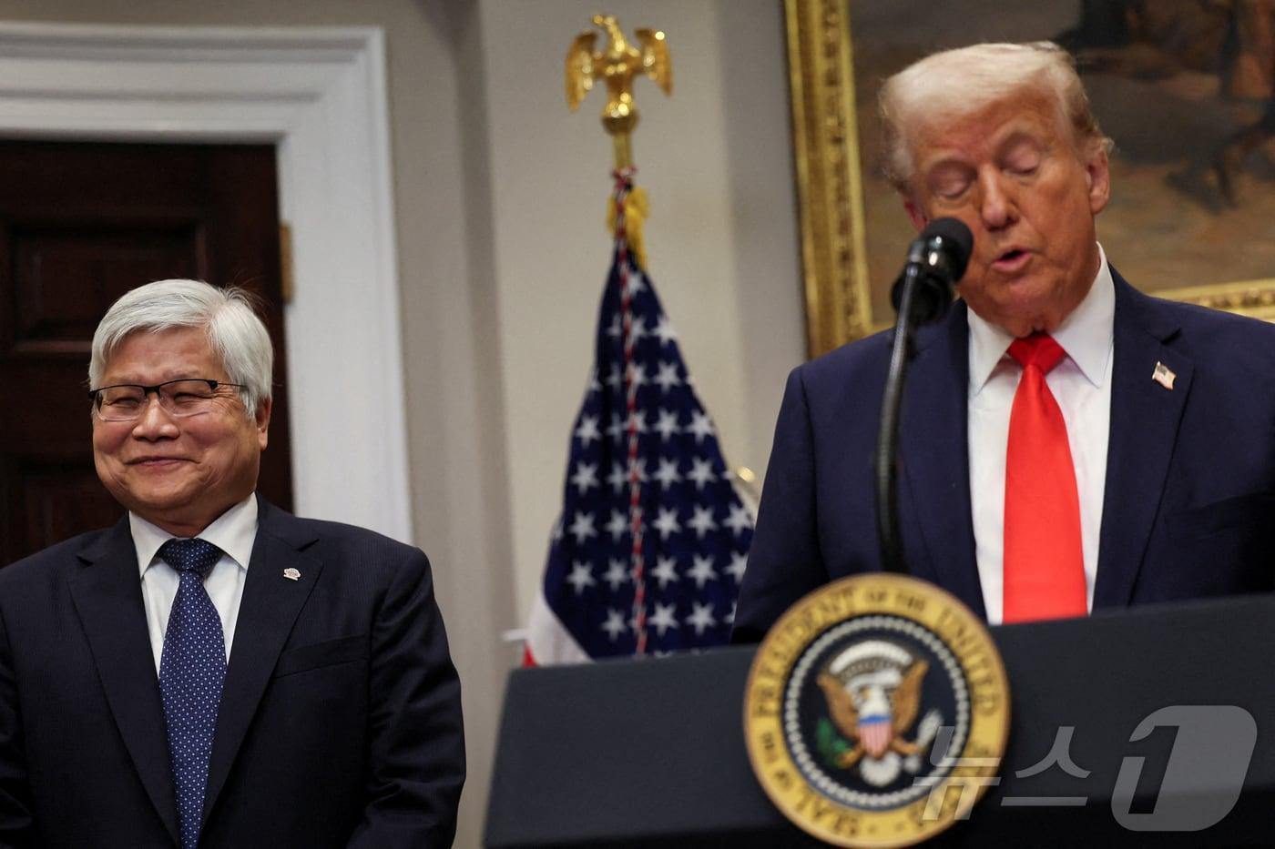도널드 트럼프 미국 대통령이 3일(현지시간) 미국 워싱턴DC 백악관 루즈벨트 룸에서 대만 반도체 제조사 TSMC의 회장 겸 최고경영자(CEO)인 웨이저자와 함께 1000억 달러 규모의 신규 투자 계획에 대해 발표하고 있다. ⓒ 로이터=뉴스1 ⓒ News1 류정민 특파원