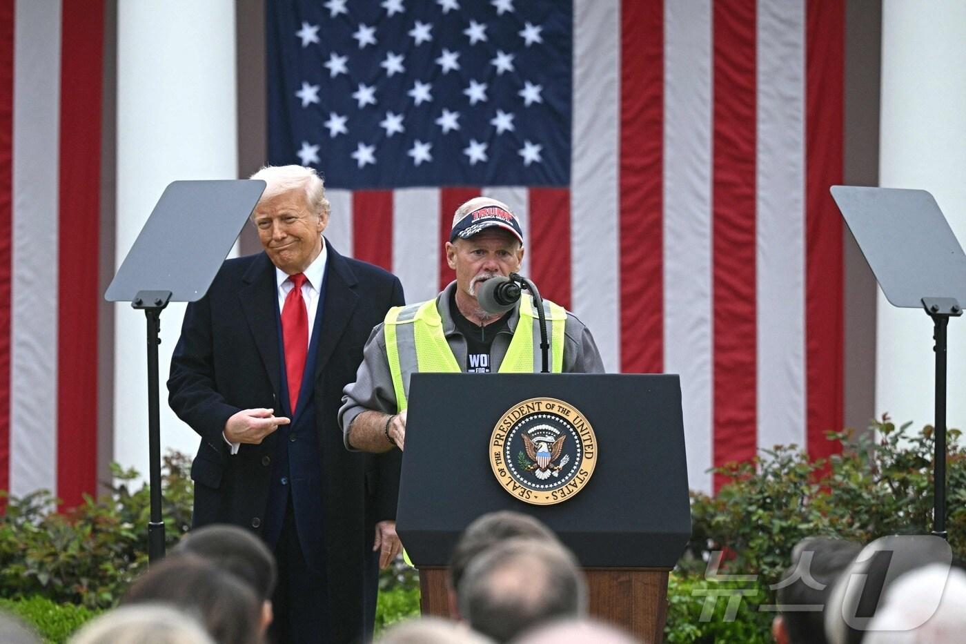도널드 트럼프 미국 대통령이 2일(현지시간) 워싱턴 백악관 로즈가든에서 열린 ‘미국을 다시 부유하게’ 행사서 상호관세를 발표하는 행정명령 서명식 중 지지하는 노동자의 연설을 듣고 있다. 2025.04.03 ⓒ AFP=뉴스1 ⓒ News1 우동명 기자