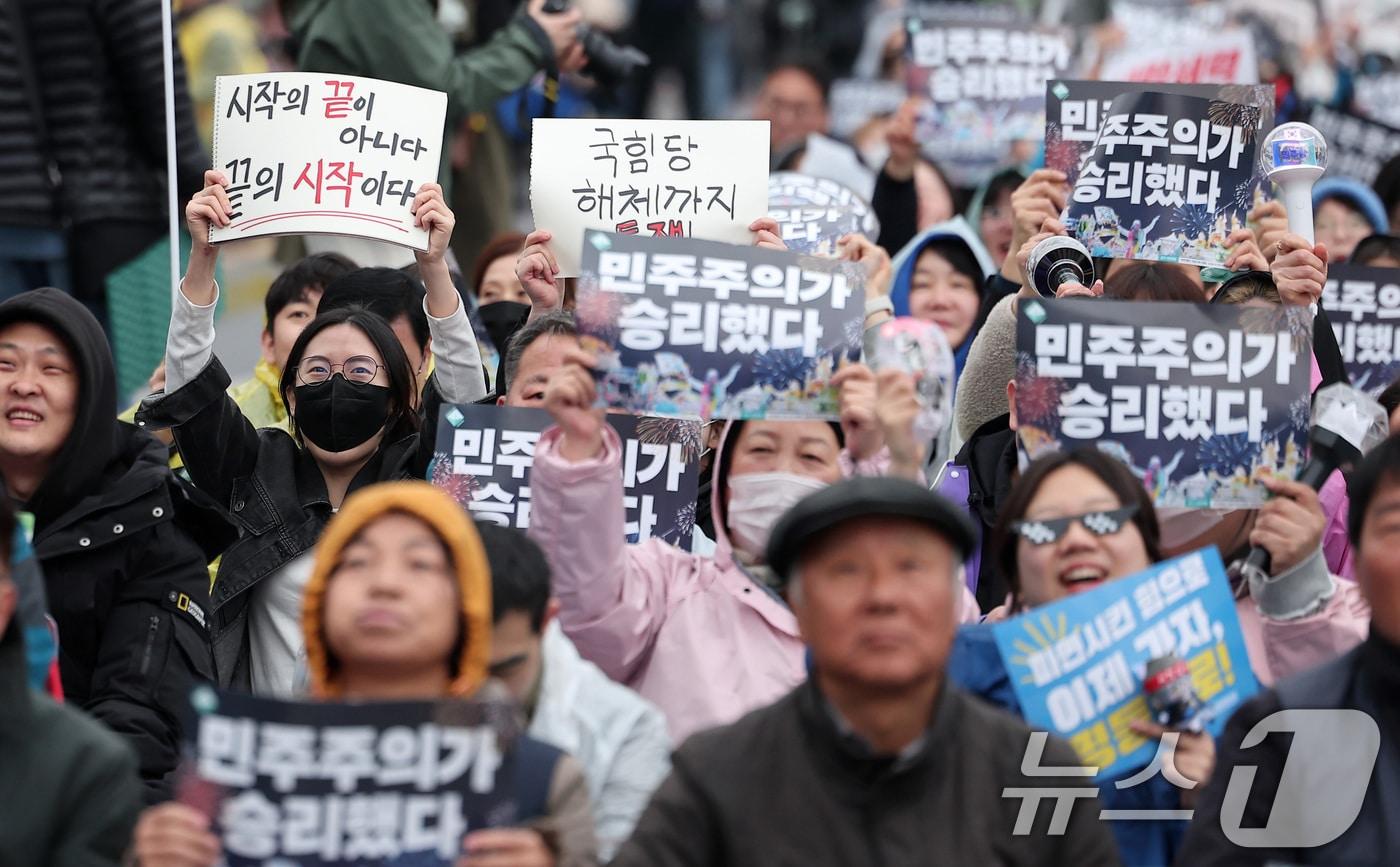 헌법재판소의 윤석열 전 대통령에 대한 파면 선고 이후 첫 주말인 5일 서울 종로구 경복구 동십자각에서 윤석열 즉각퇴진·사회대개혁 비상행동 주최로 '주권자 시민 승리의 날' 집회가 열리고 있다. 2025.4.5/뉴스1 ⓒ News1 김성진 기자
