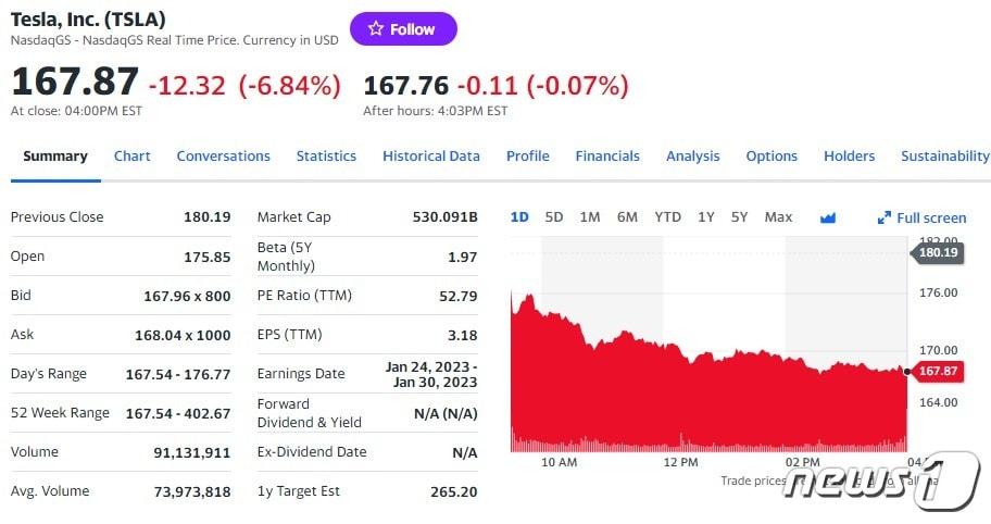 테슬라 일일 주가추이 - 야후 파이낸스 갈무리트위터 수장이된 일론 머스크 ⓒ 로이터=뉴스1 ⓒ News1 정윤미 기자루시드 일일 주가추이 - 야후 파이낸스 갈무리관련 키워드테슬라루시드박형기 기자 18일 오전 6시 마이크론 실적 발표, 또 AI 주 급락하나中 GPU 업체 메타X 상장 첫날 주가 755%까지 폭등관련 기사포드 전기차 철수, 테슬라 제외 전기차 일제 급락(종합)테슬라 3.56% 급등-루시드 5.82% 급락, 전기차 혼조(종합2)AI 주 오늘도 약세, 미증시 일제 하락…나스닥 0.59%↓(상보)테슬라 3%-리비안 12%, 루시드 제외 전기차 랠리(종합)어제는 오라클, 오늘은 브로드컴 충격…미증시 일제 급락(상보)