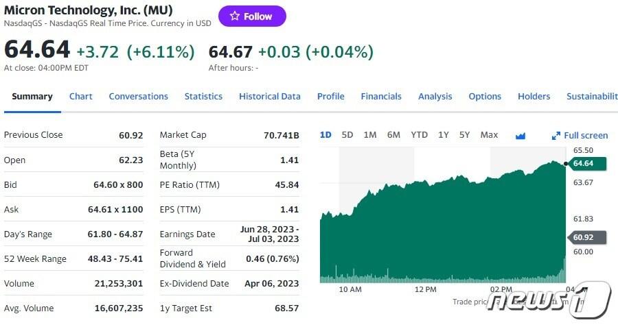 마이크론 일일 주가추이 - 야후 파이낸스 갈무리관련 키워드마이크론반도체박형기 기자 테슬라 0.39%-루시드 2.85%, 전기차 일제 하락(상보)투자사 우호적 보고서에도 테슬라 0.39% 하락관련 기사SK하이닉스, 인텔 제치고 세계 3위 등극…AI, 반도체 판 흔들었다엔비디아 0.06% 상승, 반도체지수 0.47%↑(상보)[기자의 눈]구글·애플 줄세운 'D램의시간'…슈퍼사이클 이후는135원→78만원…'동전주' SK하이닉스의 성공史[손엄지의 주식살롱]"메모리 반도체 2026년 말까지 매진, 가격 미친 듯 올라"