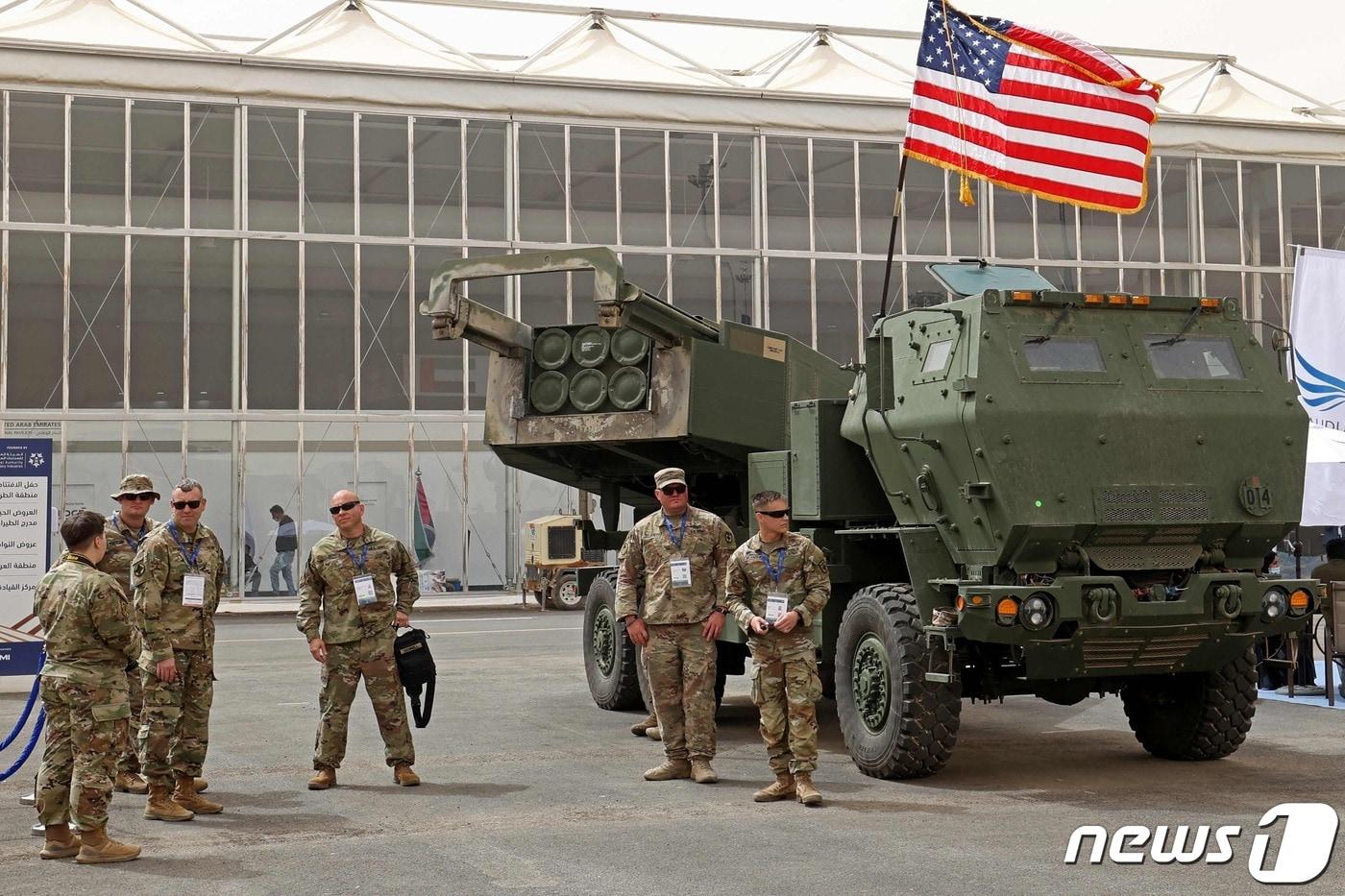 미군이 사우디아라비아 리야드에서 개최된 세계 방위 박람회 행사에서 지난 3월6일(현지시간) 고속기동포병로켓시스템(HIMARS·하이마스) 옆에 서 있는 모습. 2022.03.06/뉴스1 ⓒ AFP=뉴스1 ⓒ News1 김민수 기자