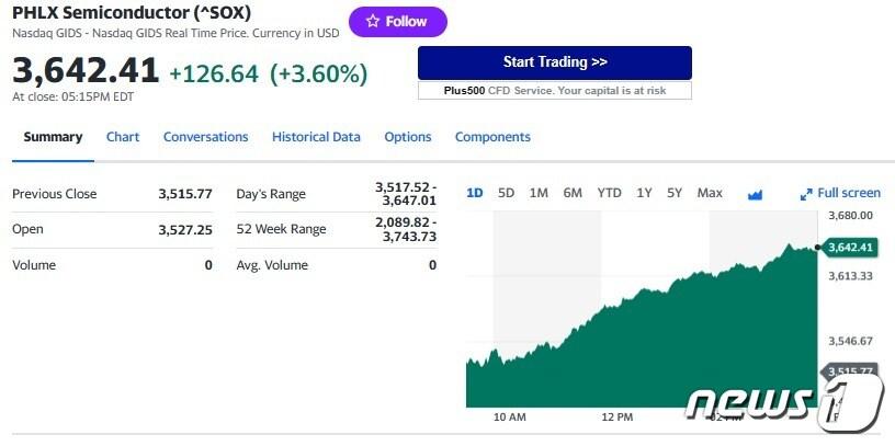 필라델피아반도체지수 일일 추이 - 야후 파이낸스 갈무리엔비디아 일일 주가추이 - 야후 파이낸스 갈무리관련 키워드필라델피아반도체지수박형기 기자 “엔비디아 연말에 시총 7조달러 돌파할 것”-야후 파이낸스“BTS 컴백 투어로 1조5000억 벌어들일 것”-BBC관련 기사외인 순매도에 코스피 4500선 '위태'…삼전·SK하닉, 동반 하락[개장시황]삼성전자, 14만원 아래로…SK하이닉스 3.17%↓[핫종목]"삼전 '역대급 실적'에도 주춤"…코스피는 4550선 등락[개장시황]AI 훈풍에 반도체주 '훨훨'…다우 0.99%↑ 신고가[뉴욕마감]'파죽지세' 3%대 뛴 코스피 4500선 눈앞…외국인 2조 폭풍매수[시황종합]