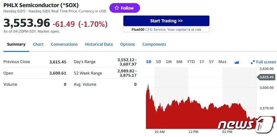 필라델피아반도체지수 일일 추이 - 야후 파이낸스 갈무리관련 키워드반도체지수박형기 기자 “지금이라도 메모리 반도체에 베팅하라”-블룸버그“TSMC 랠리로 코스피 11일 연속 신고가 행진”-블룸버그관련 기사[뉴욕개장] 반도체주 강세에 상승 출발…나스닥 0.47%↑“지금이라도 메모리 반도체에 베팅하라”-블룸버그“TSMC 랠리로 코스피 11일 연속 신고가 행진”-블룸버그TSMC 대만증시에서 3.25% 급등, 사상 최고치 경신TSMC 역대급 실적, 힘 빠지던 AI 랠리에 '동력'…반도체주 들썩(종합)