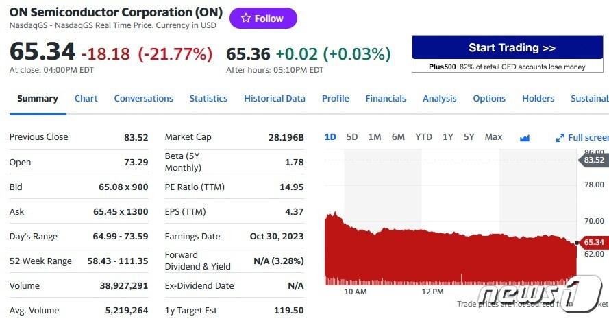 온세미콘덕터 일일 주가 추이 - 야후 파이낸스 갈무리테슬라 일일 주가추이 - 야후 파이낸스 갈무리관련 키워드온세미콘덕터박형기 기자 중국 전기차 결국 북미 대륙 상륙…테슬라 어쩌나도이치은행 투자 등급 상향에도 쿠팡 0.56% 하락관련 기사'외국기업의 날'…반도체·이차전지 외투 유공자 40명 포상