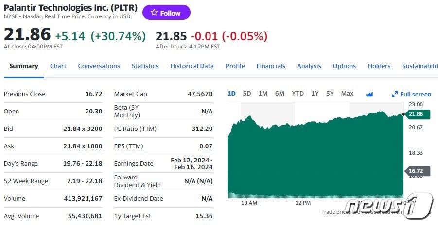 팔란티어 일일 주가추이 - 야후 파이낸스 갈무리관련 키워드팔란티어박형기 기자 “지금이라도 메모리 반도체에 베팅하라”-블룸버그“TSMC 랠리로 코스피 11일 연속 신고가 행진”-블룸버그관련 기사엔비디아 PER 45-테슬라는 302…엔비디아 저가 매수할 만하나자산운용, 미국우주항공 ETF 순자산 2000억 돌파곽동신 회장, HPSP 투자로 2416억 벌었다…수익률 640%미 베네수 침공, 전세계 방산주 랠리…한화 7%-팔란티어 4%↑야후 파이낸스가 추천한 2026년을 빛낼 기술주 5선