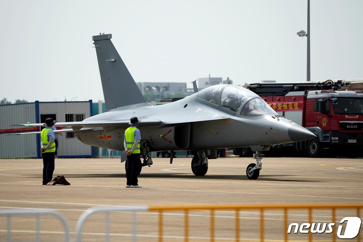 중국 에어쇼 2021이 열리는 주하이에서 28일(현지시간) 중국 인민해방군(PLA)의 공군 조종사가 JL-10 고등 훈련기를 운용하고 있다. 중국은 에어쇼에서 최신 무인기 기종을 공개할 예정이다. ⓒ 로이터=뉴스1 ⓒ News1 금준혁 기자