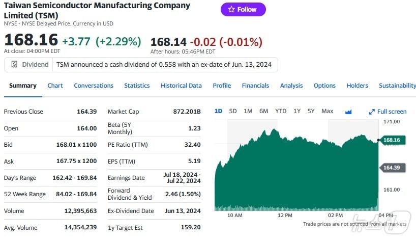 TSMC 일일 주가추이 - 야후 파이낸스 갈무리관련 키워드TSMC삼성전자박형기 기자 "이란 대규모 시위 주요 은행 파산에서 시작돼"-WSJ트럼프 관세 폭탄에도 지난해 中무역흑자 1.2조달러 '사상 최고'관련 기사SK하이닉스, 인텔 제치고 세계 3위 등극…AI, 반도체 판 흔들었다[기자의 눈]구글·애플 줄세운 'D램의시간'…슈퍼사이클 이후는삼성 앞서 20조 벽 넘은 TSMC, 이번주 실적 발표…2나노 성과 주목"삼전 '역대급 실적'에도 주춤"…코스피는 4550선 등락[개장시황]"삼전 시총 3500억달러 급증에도 상승 여력 충분"-블룸버그