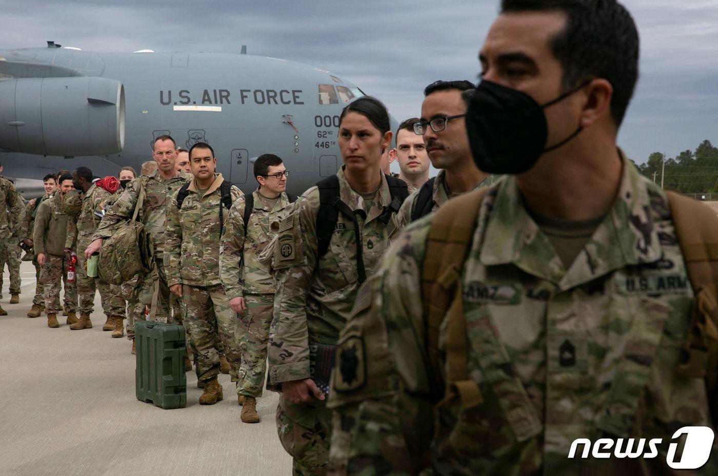 3일(현지시간) 러시아의 우크라이나 침공에 대비해 노스캐롤라이나주 육군 기지 포트 브래그에서 유럽으로 가기 위해 미국 공수부대원들이 수송기를 탑승하고 있다. ⓒ AFP=뉴스1 ⓒ News1 우동명 기자