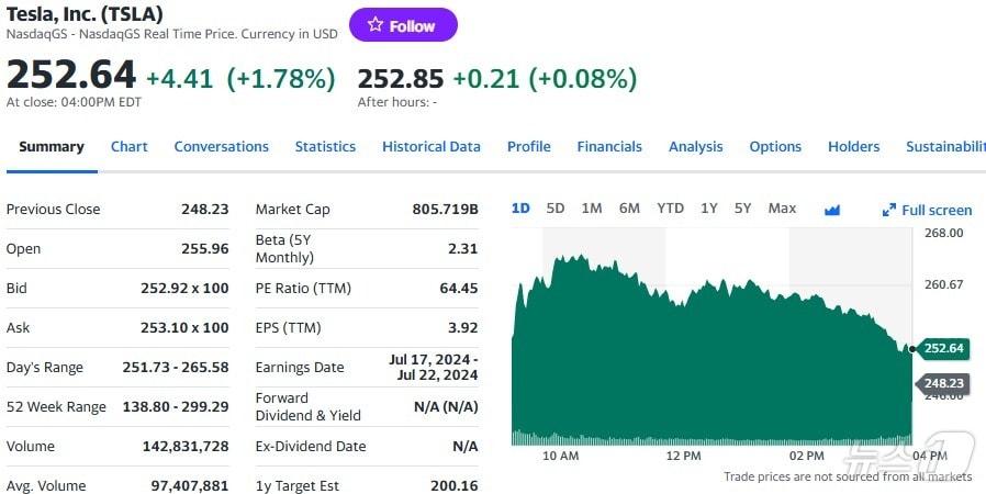 테슬라 일일 주가추이 - 야후 파이낸스 갈무리관련 키워드테슬라머스크트럼프박형기 기자 “지금이라도 메모리 반도체에 베팅하라”-블룸버그“TSMC 랠리로 코스피 11일 연속 신고가 행진”-블룸버그관련 기사프랑스 재무 "美, 그린란드 강제 병합하면 EU와 무역관계 훼손"사무직 풍자 장수만화 '딜버트' 작가 스콧 애덤스 68세로 별세"머스크, '인터넷 차단' 이란에 무료 스타링크 서비스 제공"분쟁지역 '필수템' 머스크 스타링크…이란, 전면 차단 안간힘하메네이, 트럼프 석관 깨지는 사진 올리고 "교만의 절정…곧 몰락"