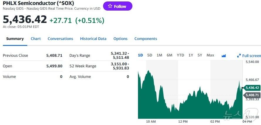 필라델피아반도체지수 일일 추이 - 야후 파이낸스 갈무리엔비디아 일일 주가추이 - 야후 파이낸스 갈무리TSMC 일일 주가추이 - 야후 파이낸스 갈무리최태원 SK 그룹 회장(왼쪽)이 반도체 위탁생산(파운드리) 기업인 TSMC의 웨이저자 회장과 6일(현지시간) 대만 타이베이 TSMC 본사에서 면담 기념 촬영을 하고 있다. (SK그룹 제공) 2024.6.7/뉴스1관련 키워드반도체지수엔비디아TSMC인텔박형기 기자 18일 오전 6시 마이크론 실적 발표, 또 AI 주 급락하나中 GPU 업체 메타X 상장 첫날 주가 755%까지 폭등관련 기사"SK하이닉스 날았다"…英FT, 올해 글로벌 주식시장 승자 선정엔비디아 0.73% 상승에도 반도체지수 0.61%↓ 7000 붕괴(종합)브로드컴 충격, 반도체 우수수…반도체지수 5.10% 급락(종합)미 대중 수출 허용, 엔비디아 급등…반도체지수 1.10%↑(종합)엔비디아 반등하는 등 반도체주 일제 랠리, 반도체지수 3%↑(종합)