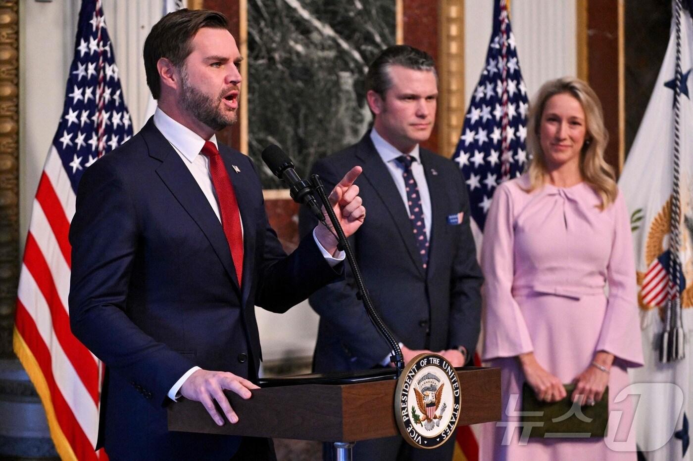 J.D. 밴스 미국 부통령이 25일(현지시간) 워싱턴DC 백악관에서 신임 미국 국방장관으로 취임하는 피트 헤그세스와 그의 아내 제니퍼 라우쳇이 지켜보는 가운데 발언하고 있다. 2025.1.25. ⓒ AFP=뉴스1 ⓒ News1 조소영 기자