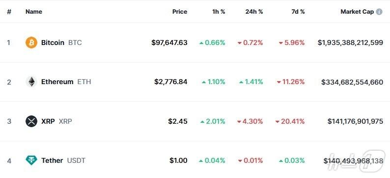 이 시각 현재 주요 암호화폐 시황 - 코인마켓캡 갈무리관련 키워드Blockchain비트코인리플박형기 기자 중국 전기차 결국 북미 대륙 상륙…테슬라 어쩌나도이치은행 투자 등급 상향에도 쿠팡 0.56% 하락관련 기사암호화폐 대부분 하락, 비트 9.5만달러 붕괴-리플 0.27%↓(상보)상원 암호화폐법 표결 연기, 서클 10% 폭락(상보)상원 암호화폐법 표결 연기, 암호화폐 일제↓ 리플 3%(상보)[속보] 암호화폐 일제 하락, 리플 3%↓ 최대 낙폭피난처 급부상, 암호화폐 랠리…비트 9만7000달러 회복(종합)