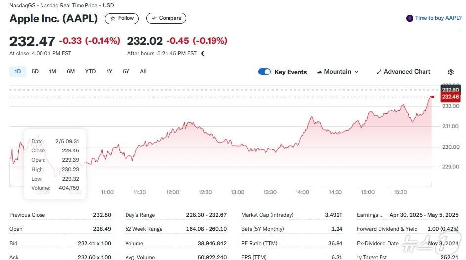 애플 일일 주가추이 - 야후 파이낸스 갈무리관련 키워드애플미중 무역전쟁구글박형기 기자 “지금이라도 메모리 반도체에 베팅하라”-블룸버그“TSMC 랠리로 코스피 11일 연속 신고가 행진”-블룸버그관련 기사中, AI 반도체 자립 가시화…삼성·SK하닉, 약일까 독일까미중 무역전쟁 최대 희생양은 결국 애플…왜?비트코인 시총 1조9100억달러 돌파, 알파벳 제치고 세계 5대 자산중국 반독점 수사, 애플 2.40% 급락