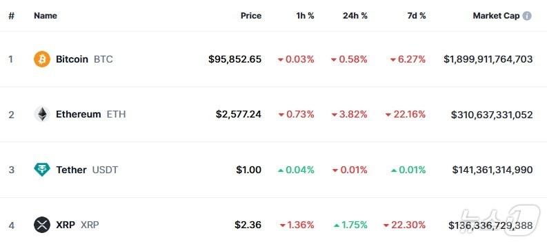 이 시각 현재 주요 암호화폐 시황 - 코인마켓캡 갈무리관련 키워드Blockchain리플비트코인리플DR박형기 기자 중국 전기차 결국 북미 대륙 상륙…테슬라 어쩌나도이치은행 투자 등급 상향에도 쿠팡 0.56% 하락관련 기사암호화폐 대부분 하락, 비트 9.5만달러 붕괴-리플 0.27%↓(상보)상원 암호화폐법 표결 연기, 서클 10% 폭락(상보)상원 암호화폐법 표결 연기, 암호화폐 일제↓ 리플 3%(상보)[속보] 암호화폐 일제 하락, 리플 3%↓ 최대 낙폭피난처 급부상, 암호화폐 랠리…비트 9만7000달러 회복(종합)