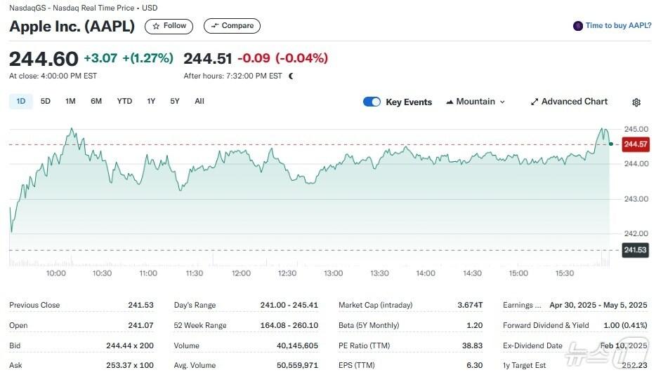 애플 일일 주가추이 - 야후 파이낸스 갈무리관련 키워드애플아이폰알리바바박형기 기자 중국 전기차 결국 북미 대륙 상륙…테슬라 어쩌나도이치은행 투자 등급 상향에도 쿠팡 0.56% 하락관련 기사"아이폰 50만원 할인"…소비촉진 中쇼핑축제 '관세전쟁 참전'마윈의 컴백…'AI전쟁 정예부대' 집합시킨 시진핑, 손 건넸다애플 아이폰 SE4 곧 출시, 오늘도 2%↑ 3일 연속 랠리중국 최고의 AI 주는 바로 OOOO…지금 투자해도 늦지 않아중국 기술주 '불마켓'…홍콩 항셍기술지수 2022년 2월 후 최고