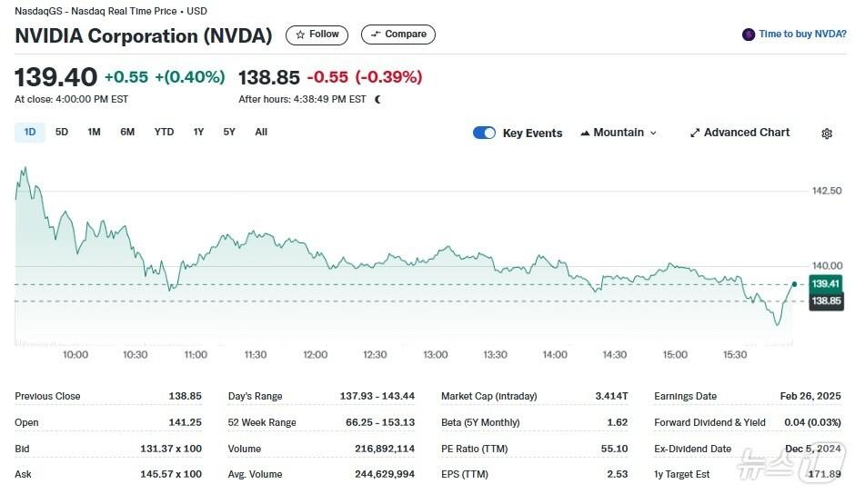엔비디아 일일 주가추이 - 야후 파이낸스 갈무리관련 키워드엔비디아AI 전용칩박형기 기자 중국 전기차 결국 북미 대륙 상륙…테슬라 어쩌나도이치은행 투자 등급 상향에도 쿠팡 0.56% 하락관련 기사엔비디아 PER 45-테슬라는 302…엔비디아 저가 매수할 만통상본부장 "美 엔비디아칩 포고문 韓영향 파악차 귀국 미뤄"(종합)중국 H200 사용 규제, 엔비디아 1.44% 하락인텔 7%-AMD 6% 급등, 반도체지수 1% 상승(종합)중국 연구소에 한해 H200칩 사용 허용, 엔비디아 0.47%↑