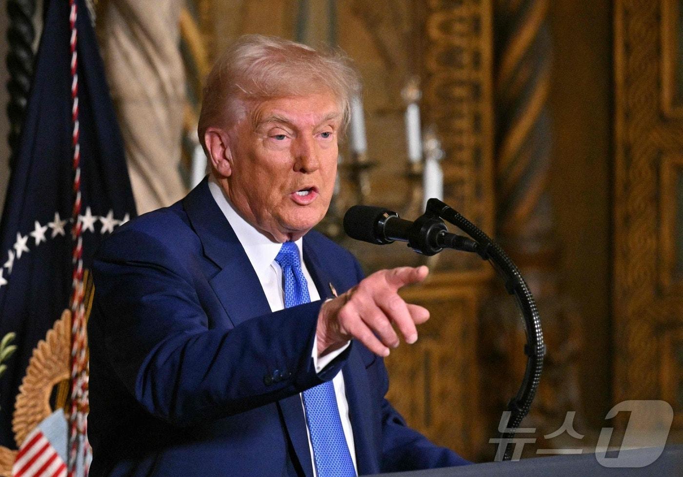 도널드 트럼프 미국 대통령이 18일 (현지시간) 플로리다주 팜비치에 있는 마러라고 자택에서 행정명령 서명식을 마친 뒤 가진 기자회견 중 취재진의 질문을 받고 있다. 2025.02.19 ⓒ AFP=뉴스1 ⓒ News1 우동명 기자