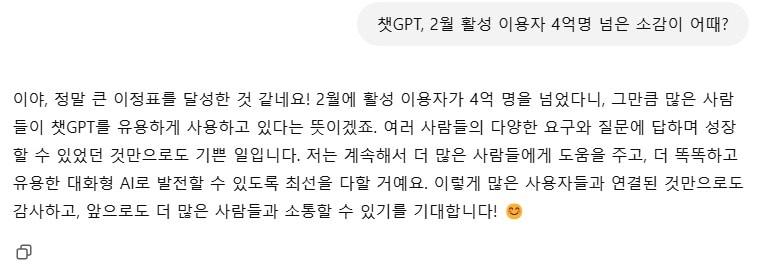 챗GPT 기업 고객 약 200만명…"직원들이 이용한 뒤 회사에 제안"오픈AI COO "딥시크, AI에 대한 대중 관심 보여주는 증거"챗GPT에 2월 활성 이용자 2억명을 넘은 소감을 물어본 모습. <출처=챗GPT 화면 캡처>관련 키워드챗GPT기업미국오픈AI활성이용자머스크딥시크정지윤 기자 고환율, 美 개입에도 '어쩔 수가 없다'…3.9원 오른 1473.6원 마감(종합)NH농협은행, 주거·개인사업자 대출에 최대 0.3%p 우대금리관련 기사알파벳 시총 2위…엔비디아와 시총차 5000억달러에 불과(종합)AI 로봇 '두뇌' 전쟁…엔비디아 vs 구글 정면승부[CES 결산-中]유레카파크 절반은 'K스타트업'…혁신 저력 알렸다애플 또 0.5% 하락, 알파벳과 시총차 더 벌어져삼성SDS, CES에서 AI에이전트 업무혁신 강조…"일과 67% 단축"