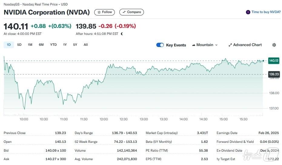 엔비디아 일일 주가추이 - 야후 파이낸스 갈무리관련 키워드엔비디아블랙웰오펜하이머반도체주박형기 기자 중국 전기차 결국 북미 대륙 상륙…테슬라 어쩌나도이치은행 투자 등급 상향에도 쿠팡 0.56% 하락관련 기사젠슨 황 "5000억달러 주문 들어왔다" 깜짝 실적 예고(상보)엔비디아 0.64% 상승에도 반도체지수 0.02% 상승에 그쳐(상보)