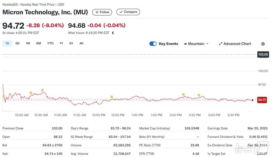 마이크론 일일 주가추이 - 야후 파이낸스 갈무리관련 키워드마이크론반도체주실적발표박형기 기자 CPI 13일 밤 10시 30분 발표, 금리 동결에 힘 실어줄 듯중앙은행장에 소환장, 미국 국격 튀르키예 수준으로[시나쿨파]관련 기사"삼전 '역대급 실적'에도 주춤"…코스피는 4550선 등락[개장시황]"거인이 뛴다" 삼성전자, 이틀째 7%대 급등…'14만전자' 눈앞[핫종목]SK하이닉스, 한 달 반 만에 장중 '60만닉스' 회복[핫종목]S&P 0.6% 상승, 사흘 연속 올라…산타랠리 기대감 고조[뉴욕마감]마이크론 10% 폭등…강력한 실적 전망에 엔비디아도 2% 상승