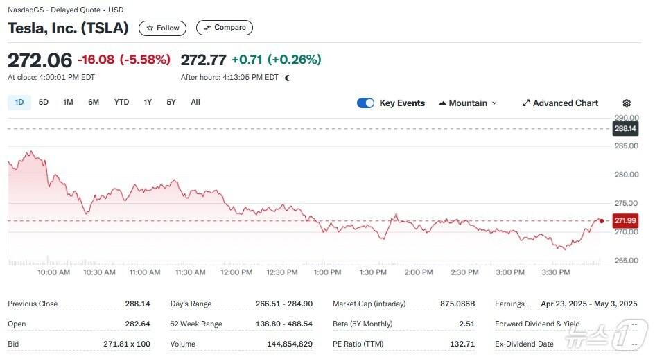 테슬라 일일 주가추이 - 야후 파이낸스 갈무리관련 키워드테슬라전기차GM포드자동차 관세박형기 기자 “지금이라도 메모리 반도체에 베팅하라”-블룸버그“TSMC 랠리로 코스피 11일 연속 신고가 행진”-블룸버그관련 기사잇따른 조 단위 수주 취소에…김정관, 배터리 3사 지난주 긴급소집美 캐즘에 수십조원 공중분해 K배터리…믿을 건 ESS·LFP美 보조금 폐지 여파…SK 배터리 투자 연기, 포스코 계약 축소(종합)현대차·기아, 4년 연속 글로벌 '톱3'…신차 5대 중 1대 '수입차'장재훈 현대차 부회장 "수소 밸류체인 구축, 에너지 자주권 확보"