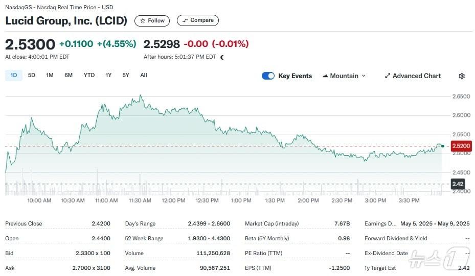루시드 일일 주가추이 - 야후 파이낸스 갈무리지난달 31일(현지시간) 로마 테슬라 전시장에서 방화로 추정되는 불이 나 차량 17 대가 전소했다. ⓒ 로이터=뉴스1 ⓒ News1 박형기 기자관련 키워드루시드테슬라전기차박형기 기자 “지금이라도 메모리 반도체에 베팅하라”-블룸버그“TSMC 랠리로 코스피 11일 연속 신고가 행진”-블룸버그관련 기사테슬라 0.13%-루시드 7.29%, 전기차 일제 하락(상보)TSMC 랠리+은행주 급등, 미증시 일제↑ 다우 0.60%(상보)테슬라 1.79%-리비안 7.16%, 전기차 일제 하락(종합)테슬라 0.39%-루시드 2.85%, 전기차 일제 하락(상보)테슬라 0.89% 상승한 것 제외하고 전기차 일제 하락(상보)