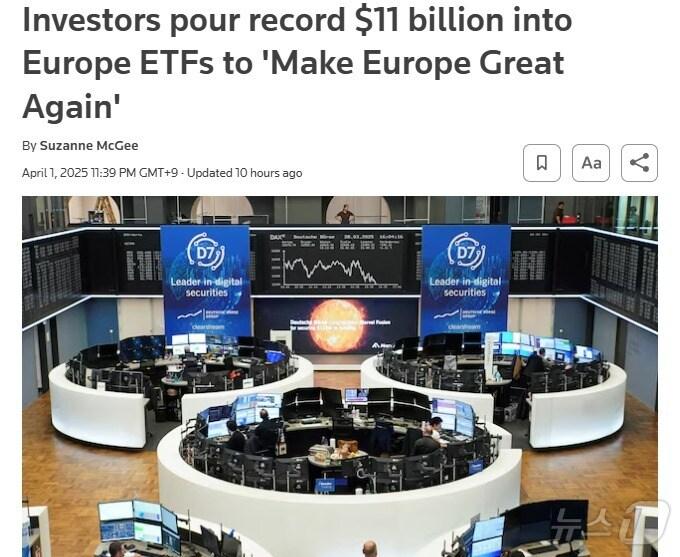 해당 기사 - 로이터 갈무리관련 키워드유럽 ETF트럼프관세폭탄박형기 기자 “지금이라도 메모리 반도체에 베팅하라”-블룸버그“TSMC 랠리로 코스피 11일 연속 신고가 행진”-블룸버그관련 기사천장 뚫은 금값 어디까지 가나…"질주 막을 요인이 없다"